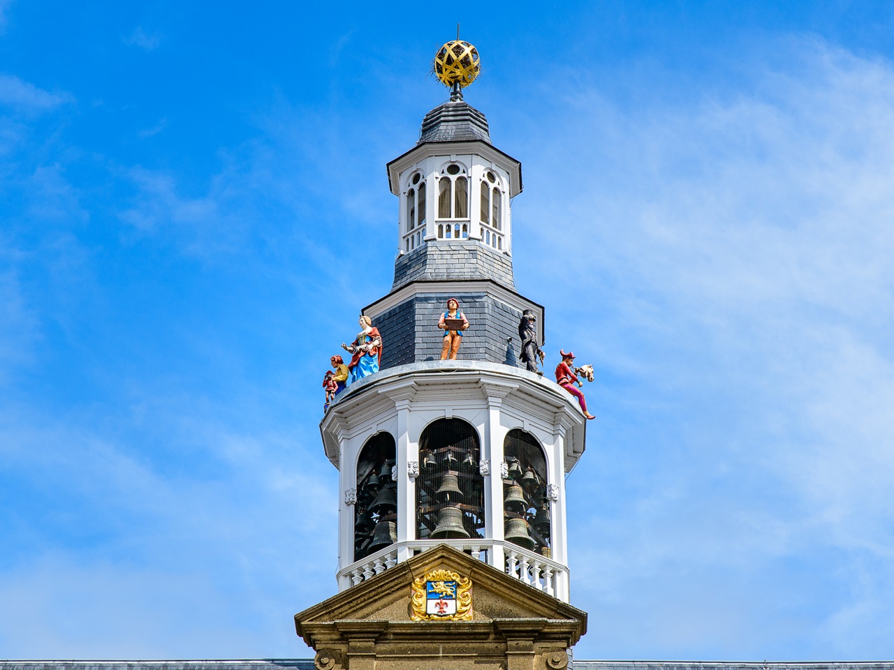 Glockenspiel des Rathauses in Roermond mit den historischen Figuren rund um den Turm.
