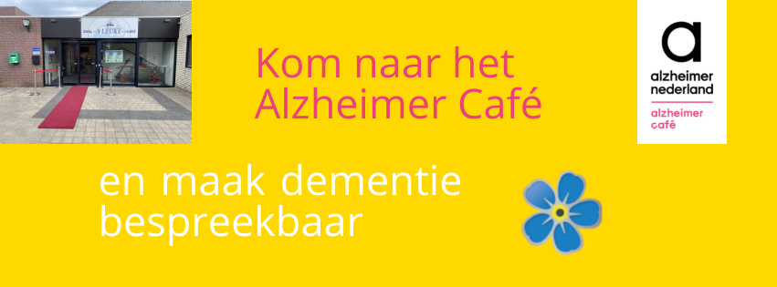 Banner van het Alzheimer Café Maasgouw met de tekst ‘Kom naar het Alzheimer Café en maak dementie bespreekbaar’